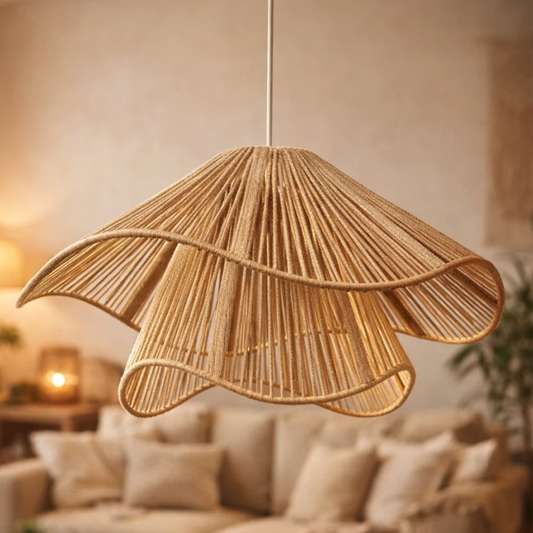 نور پخششده از میان بافتها، نه تند است نه کم، بلکه دقیقا همون گرمای لطیفیه که فضا رو دلانگیز میکنه. کیفیت ساخت بالا، ظرافت در گرهها و الیاف استفادهشده، باعث میشن این لوستر هم کارکردی باشه، هم دکوراتیو.