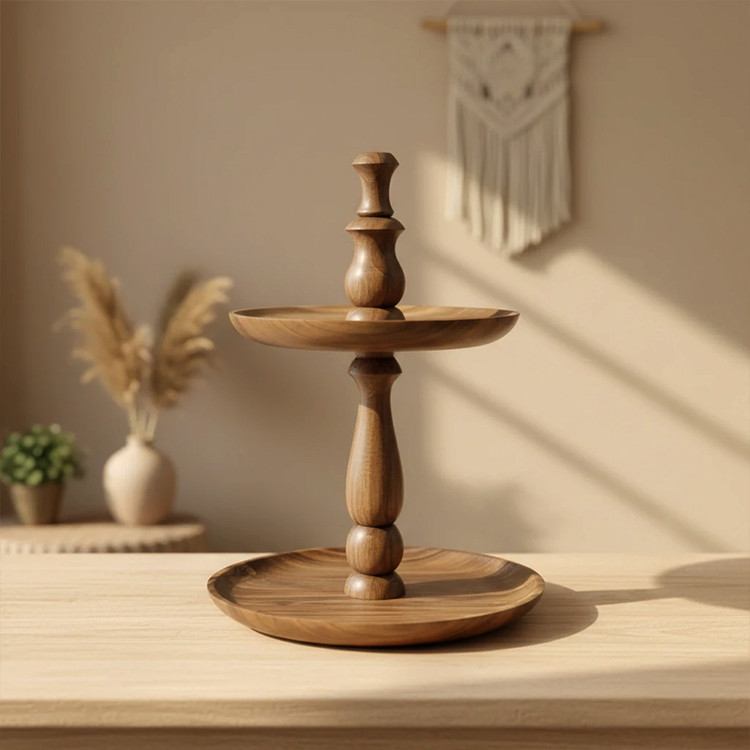 این شیرینیخوری دوطبقه چوبی، تلفیقی از سادگی، تقارن و گرمای متریال طبیعی است. فرم متعادل پایه مرکزی در کنار بشقابهای چوبی خوشتراش، حس نظم و اصالت را به میز پذیرایی منتقل میکند.